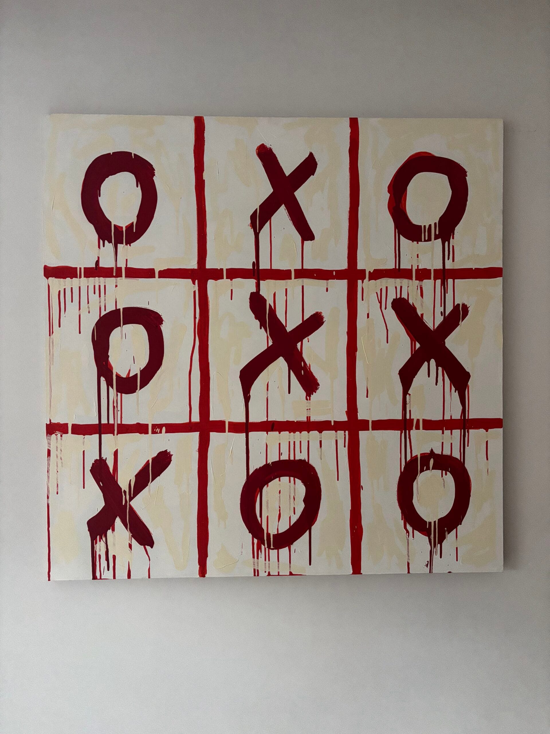 W rękach Włodzimierza Pawlaka „Kółko – krzyżyk” przestaje być jedynie dziecięcą zabawą, a staje się opowieścią o sile, dominacji i napięciu. Na niemal świetlistym, białym tle dostrzegamy finał rozgrywki, w którym triumfuje krzyżyk – znak męskiej energii. Czerń, ostra i zdecydowana, wprowadza ton powagi, jak cień towarzyszący konfliktowi. Ruchliwe, nerwowe pociągnięcia pędzla ożywiają scenę, nadając jej dramatyczny rytm. W epoce pełnej społecznych i politycznych niepokojów obraz ten staje się refleksją o tym, jak prosta gra może przemienić się w symbol walki o przewagę.