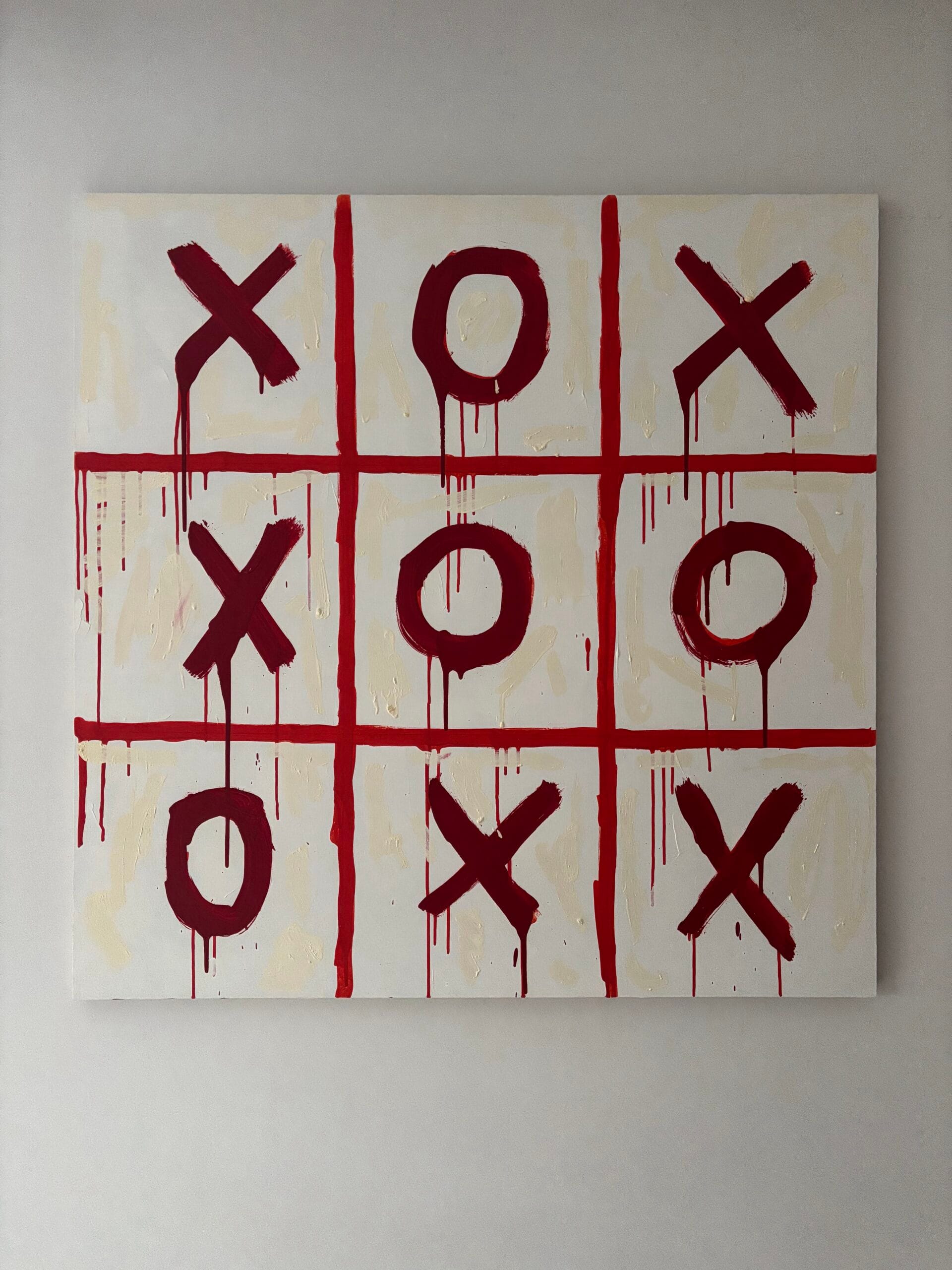 „Kółko i krzyżyk”, pozornie niewinna gra z dzieciństwa, w twórczości Włodzimierza Pawlaka zyskuje zupełnie nowy, symboliczny ciężar. Na obrazie widzimy finał rozgrywki, w której przewagę zdobywa krzyżyk – znak siły i męskości. Dominująca biel, charakterystyczna dla Pawlaka, tworzy chłodne, niemal ascetyczne tło, podczas gdy czerń akcentuje dramatyzm i konflikt. Gwałtowne pociągnięcia pędzla wzmagają wrażenie napięcia, sugerując, że gra stała się metaforą realnych sporów. W obliczu współczesnych napięć społecznych i politycznych dzieło to przekształca prostą zabawę w komentarz na temat rywalizacji i jej niejednoznacznych konsekwencji.