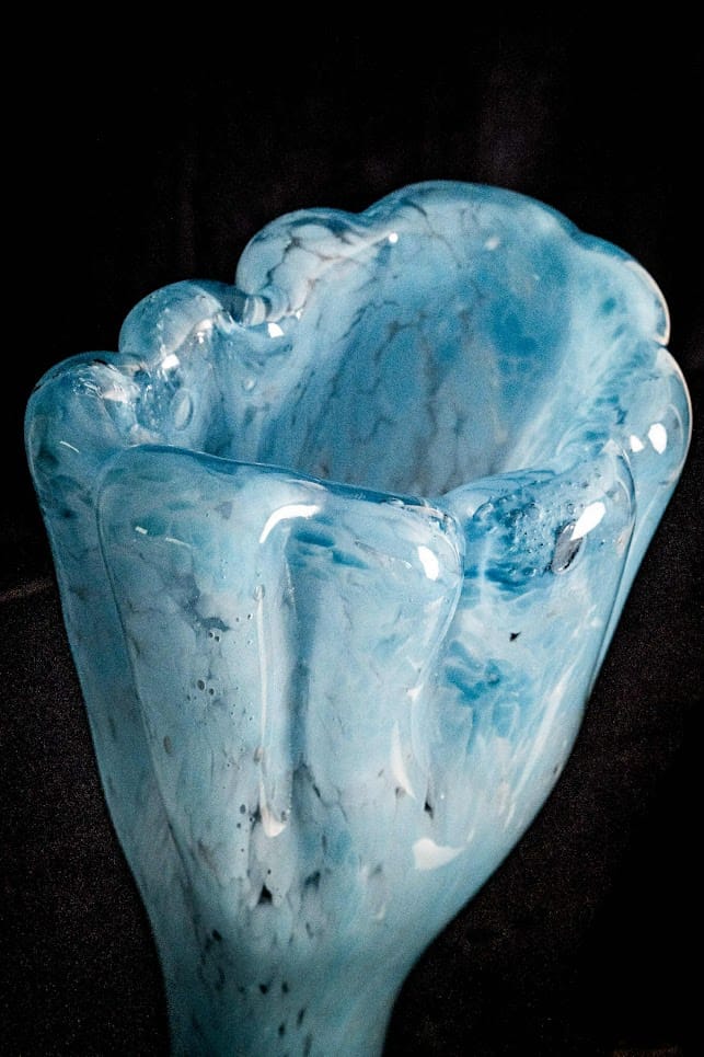 “Dream IV” is a slender organic sculpture reminiscent of a bud, chalice or unfolding tissue. Its soft milky-blue tint gives the piece a sense of lightness, while the solid base evokes grounding and protection — echoing the mother-child bond central to the series. Each form in “Dreams” is shaped hot at the furnace using the artist’s distinctive hand-forming technique. Glass sculpture, surface-coloured soda-lime glass. Hot-formed, hand-shaped glass technique.